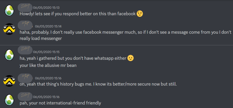 Over the space of several months, Sam and Matt spoke every day through chat, or whatsapp calls or just simple memes. All until the 27th June 2020 where Sam (after changing her mind) asked Matt if he still wanted to “give this a go”.